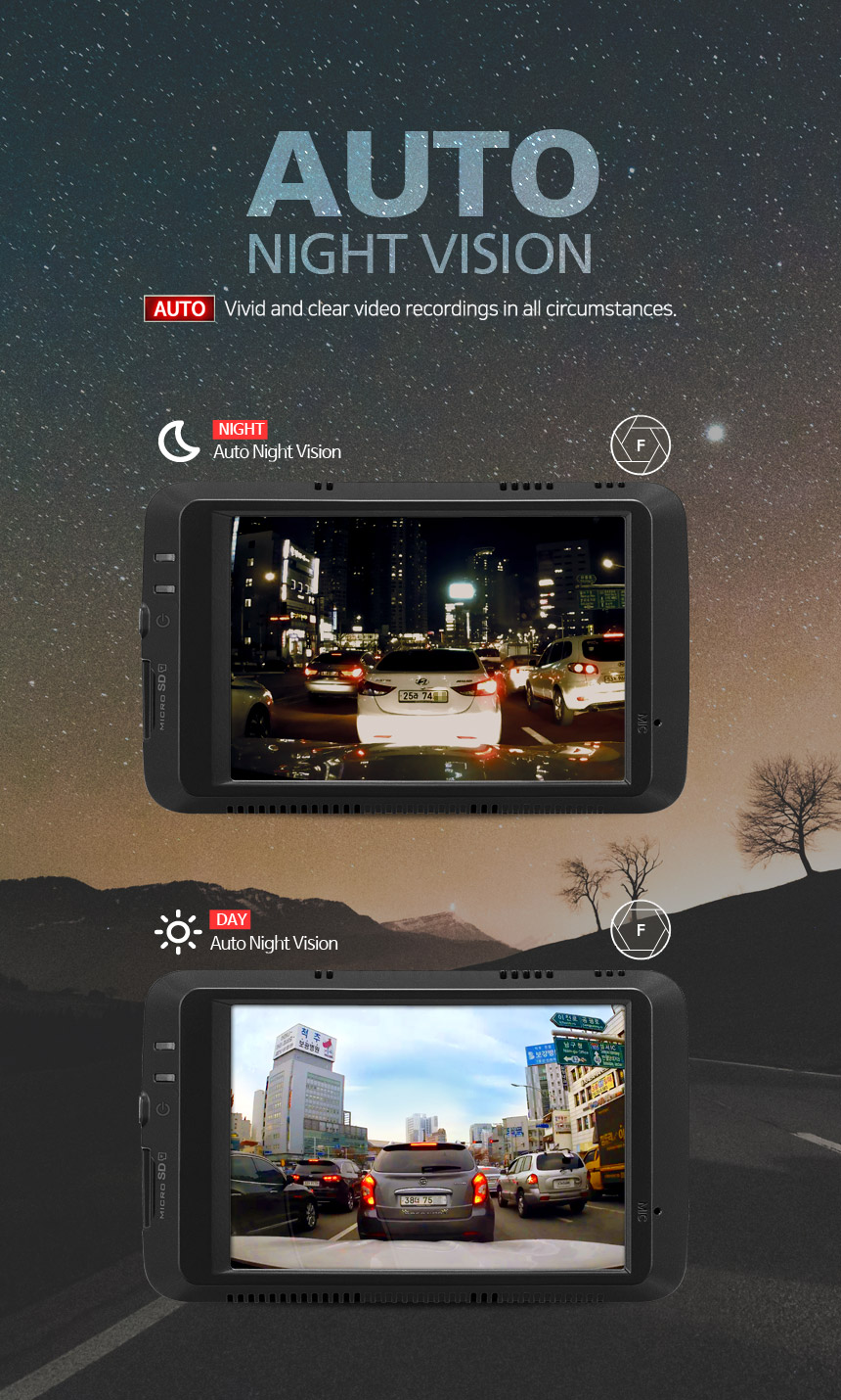 AUTO NIGHT VISION enables FineVu LX500 to record clear and balanced video in tough-to-capture environments like nighttime, underground parking lots and tunnels, as well as very bright day light.