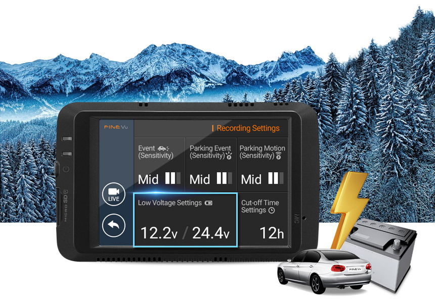 If the battery voltage of your car drops below a preset level, FineVu LX500 automatically detects and cuts off it's own power to protect the battery of your car.